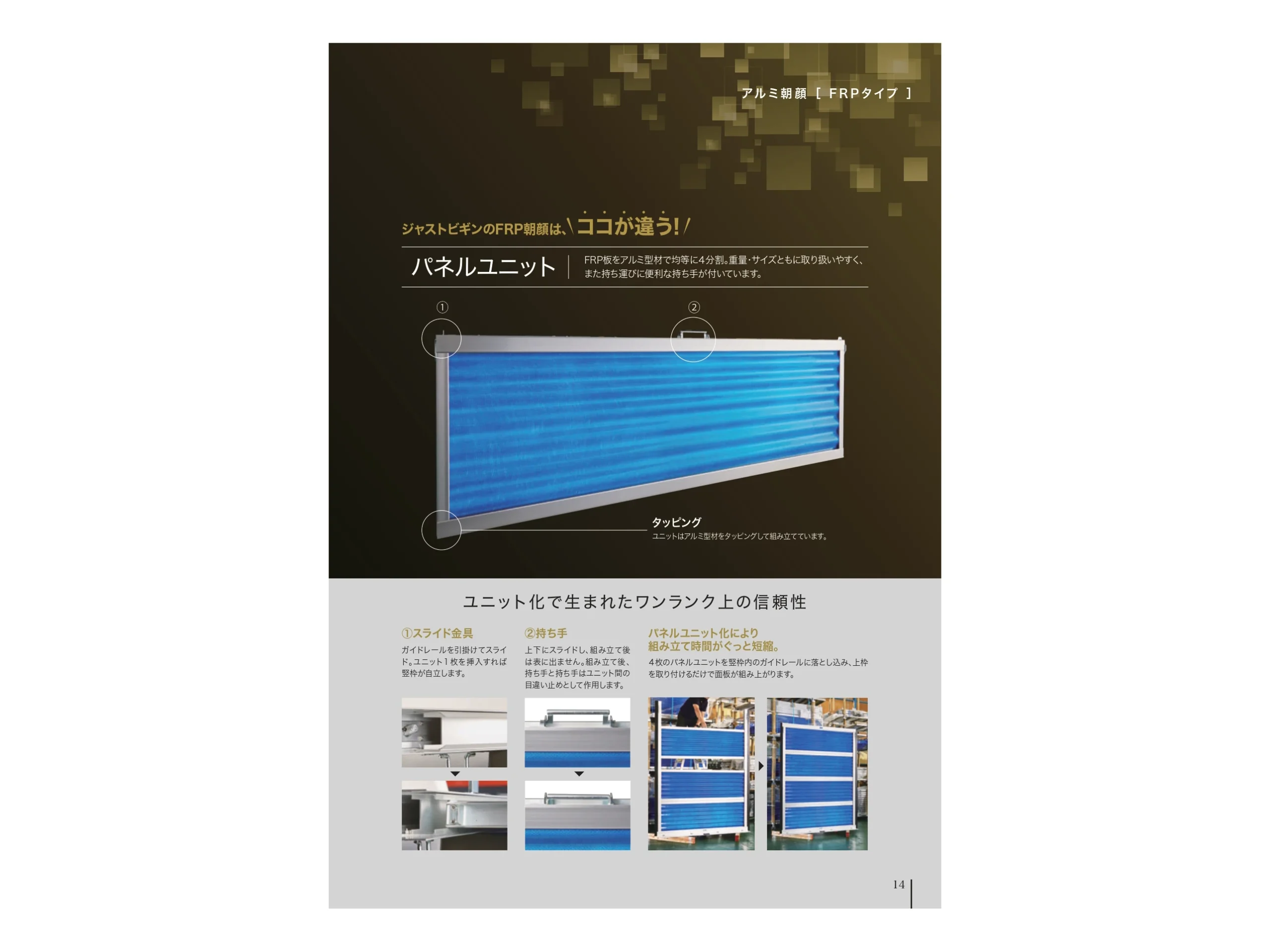 本製品はFRP板をユニット化した「パネルユニット」を、堅枠に内蔵したガイドレールに落としこむだけ。