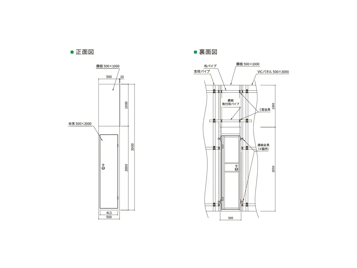 VICパネル1枚分の幅500ミリのミニ扉です。現場内側にスペースが取りづらい場合や荷物の搬入・搬出がない場合はこちらの扉が役立ちます。