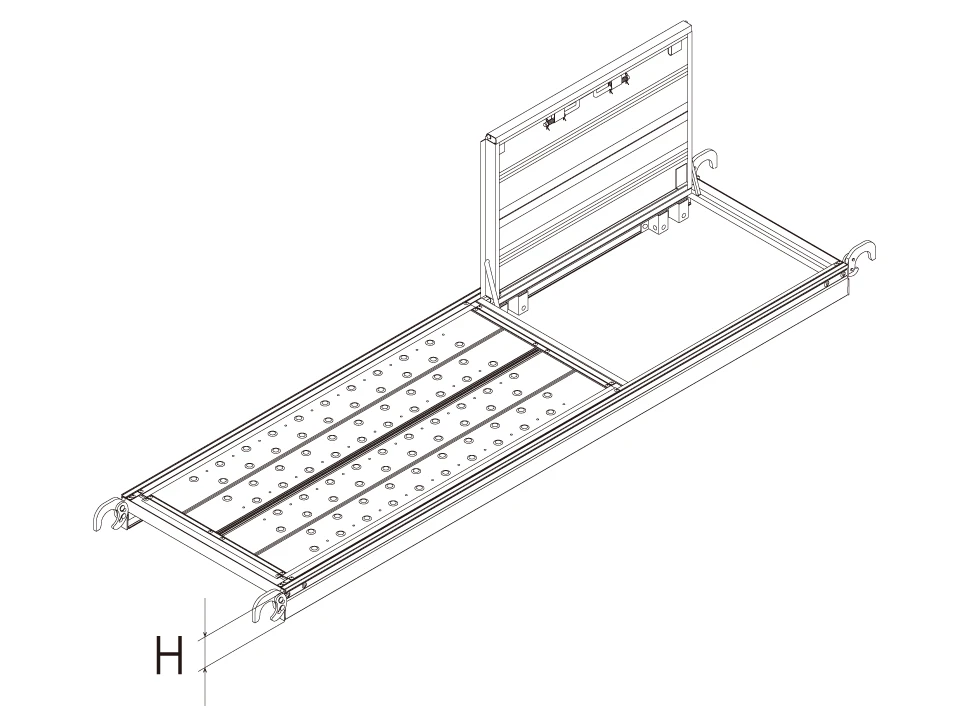 開閉式床付き布枠は、安全かつ安心な昇降を提供しつつ、作業床としても使用可能です。伸縮と収納が可能なはしごは、足場内での安全な昇降を確保します。