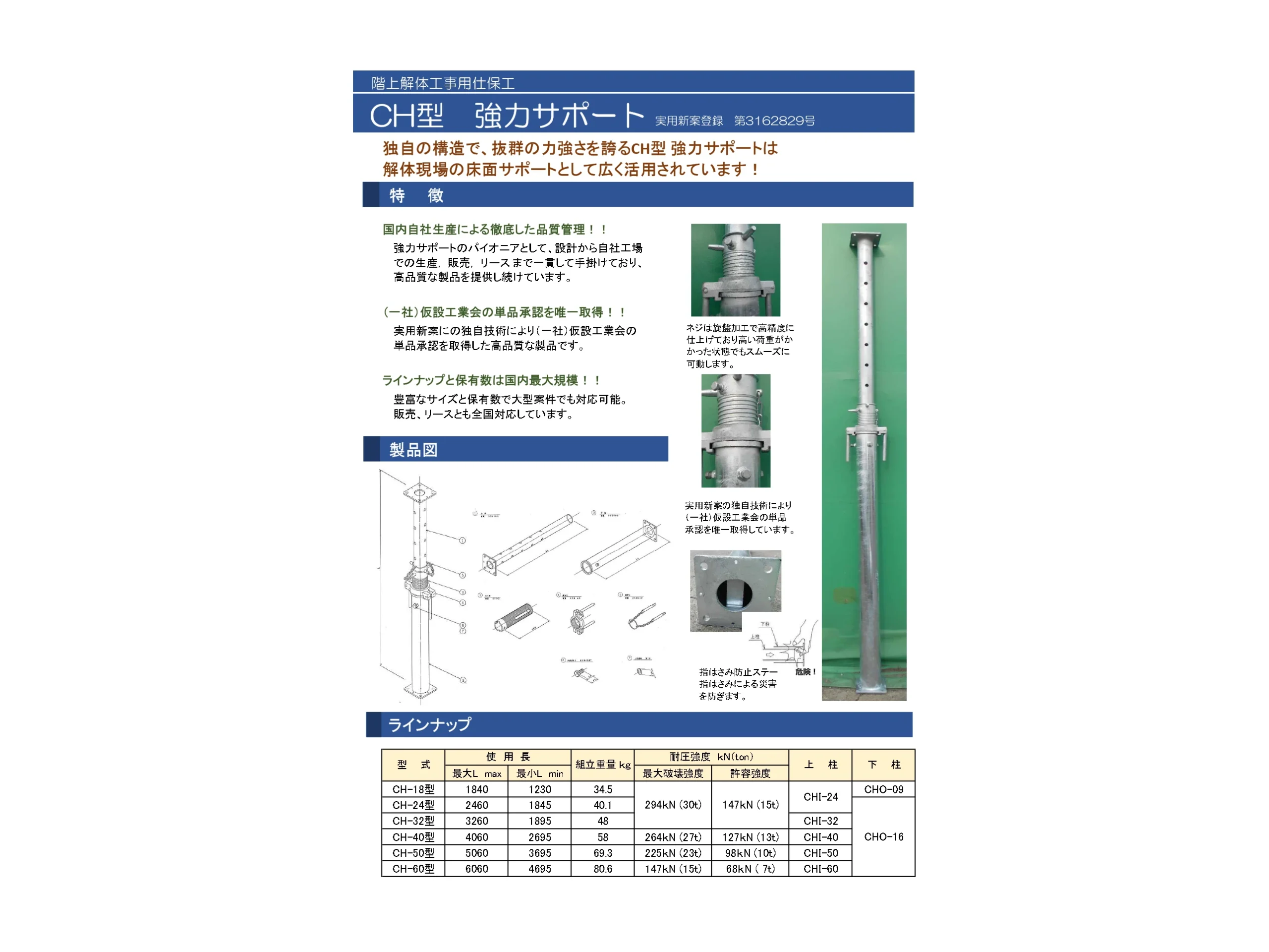 独自の構造で、抜群の力強さを誇るCH型強力サポートは解体現場の床面サポートとして広く活用されています!国内自社生産による徹底した品質管理!!強力サポートのパイオニアとして、設計から自社工場での生産,販売,リースまで一貫して手掛けており、高品質な製品を提供し続けています。(一社)仮設工業会の単品承認を唯一取得!!実用新案にの独自技術により(一社)仮設工業会の単品承認を取得した高品質な製品です。インナップと保有数は国内最大規模!!豊富なサイズと保有数で大型案件でも対応可能。販売、リースとも全国対応しています